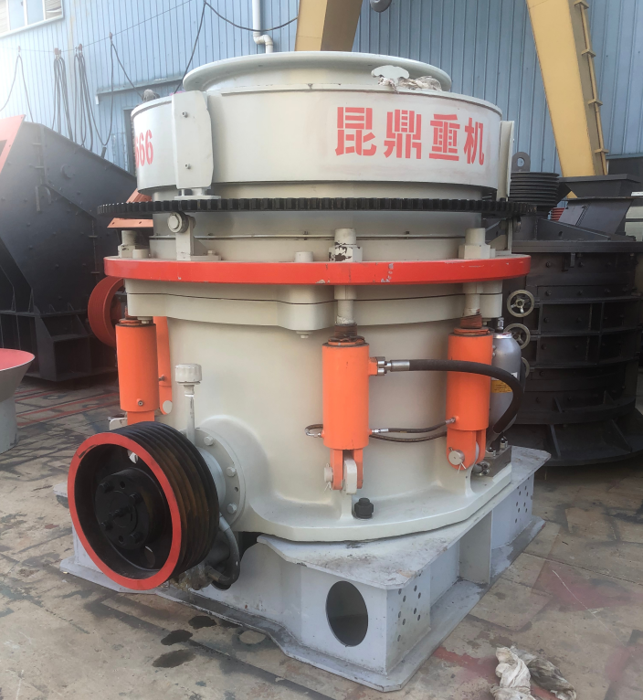 在工作时通过电动机的旋转带动带轮或联轴器、传动轴和圆锥部在轴心线下使偏心轴做周期性旋摆运动。在物料从料口进入破碎腔后因受到偏心轴和轧臼壁的相互冲击挤压、研磨、揉搓从而产生破碎的作用。液压保险系统能在机器发生过铁故障或者闷车现象时通过液压将支撑套和定锥部排除出故障物,在起到很好的保险作用的同时大大的降低了维修率及提高生产效率。