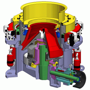在工作时通过电动机的旋转带动带轮或联轴器、传动轴和圆锥部在轴心线下使偏心轴做周期性旋摆运动。在物料从料口进入破碎腔后因受到偏心轴和轧臼壁的相互冲击挤压、研磨、揉搓从而产生破碎的作用。液压保险系统能在机器发生过铁故障或者闷车现象时通过液压将支撑套和定锥部排除出故障物,在起到很好的保险作用的同时大大的降低了维修率及提高生产效率。