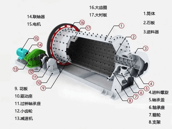 球磨机由给料部、出料部、回转部、传动部(减速机,小传动齿轮,电机,电控)等主要部分组成。中空轴采用铸钢件,内衬可拆